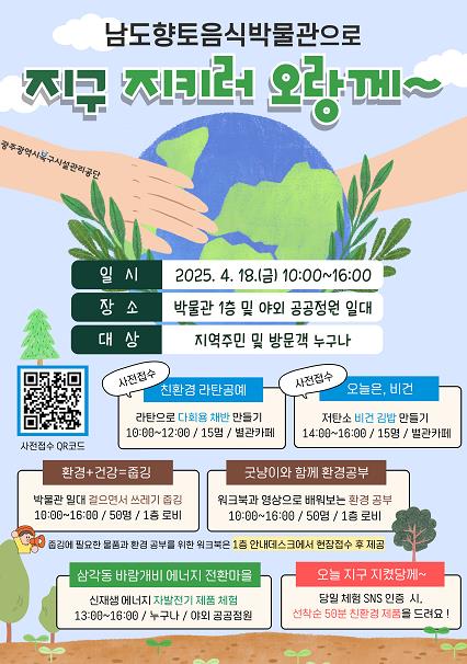 [코리아 이슈저널=김종오 기자] 광주북구시설관리공단은 제55주년 지구의 날을 기념하여 오는 18일, 10:00부터 16:00까지 남도향토음식박물관 1층 및 야외 공공정원에서 ‘지구 지키러 오랑께~’ 행사를 개최한다고 밝혔다.