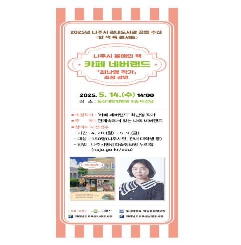 [코리아 이슈저널=김종오 기자] 전라남도 나주시는 2025 나주시 올해의 책에 ‘행운이 구르는 속도’, ‘달리는 강하다’, ‘카페 네버랜드’, ‘내면소통’을 선정하고, 이 중 ‘카페 네버랜드’ 최난영 작가를 초청해 ‘한 책 톡 콘서트’를 개최한다고 밝혔다.