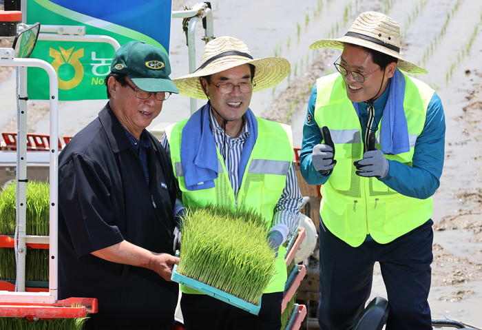 | ▲ 지난 5월 24일 경기 이천시 율면농협 육묘장에서 열린 '드문 모심기 농작업대행 시연회'에서 이성희 농협중앙회장(가운데)과 송석준 국회의원(오른쪽)이 반자율주행 이양기에 실리는 모를 들고 기념촬영을 하고 있다. 2022.5.24 [경기사진공동취재단] |