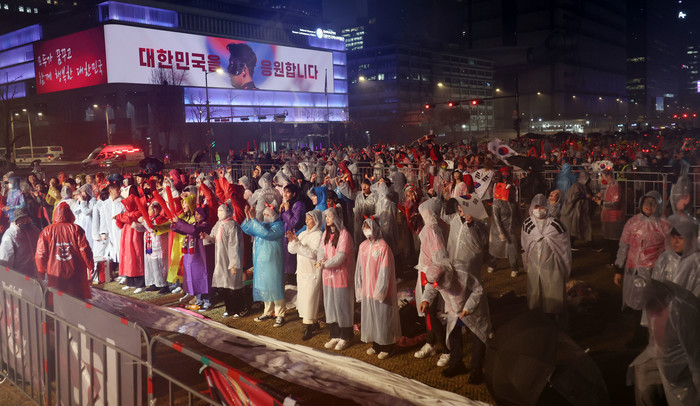 | ▲ 28일 오후 서울 광화문광장에서 열린 2022 카타르월드컵 조별리그 H조 2차전 한국과 가나 전을 앞두고 시민들이 비가 내리는 가운데 열띤 응원전을 펼치고 있다. 2022.11.28 |