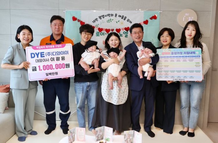 이날 광양시 보건소는 백일축하 케이크를 준비해 따뜻한 마음을 더했으며, 이광용 DYE 대표이사도 함께 방문해 삼태아 가정에 육아용품 구입비 100만 원을 후원하며 기쁨을 함께했다.