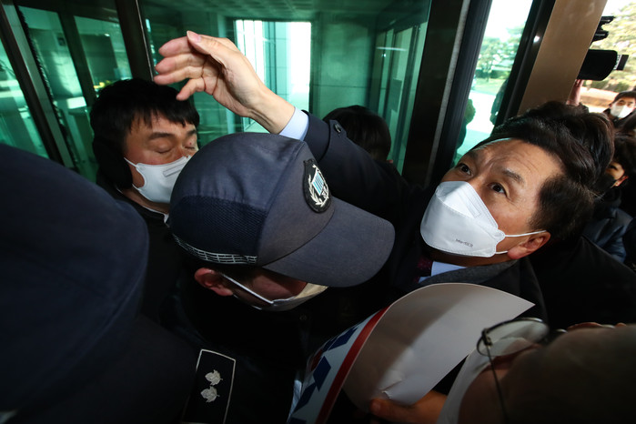 | ▲ 국민의힘 김기현 원내대표 등 의원들이 12일 서울 서초구 대검찰청 앞에서 더불어민주당 이재명 대선후보의 '변호사비 대납 의혹'을 최초로 제보했던 이모 씨가 숨진 채 발견된 것과 관련해 항의 방문, 대검에 진입하려다 방호직원들에게 제지당하고 있다. 2022.1.12 [국회사진기자단] |