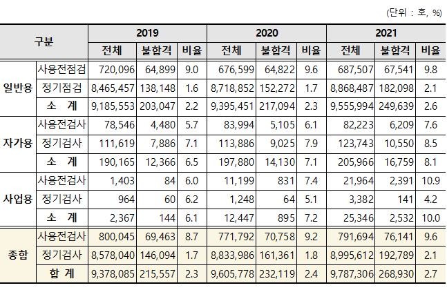 검사 중 사용전 검사 불합격률은 9.6%로 전년 대비 0.4%포인트(p) 늘었다.