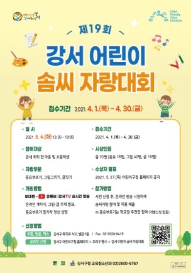 서울 강서구(구청장 노현송)는 오는 5월 4일 온라인으로 개최하는 어린이 솜씨 자랑대회에 참가할 어린이들을 모집한다고 밝혔다.