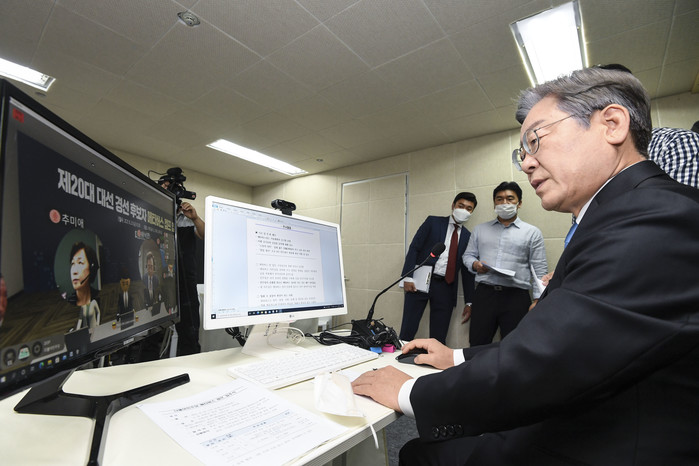 | ▲ 더불어민주당 대선 경선 후보인 이재명 경기도지사가 20일 서울 여의도 선거캠프에서 열린 더불어민주당 메타버스 캠프 입주식에 참가하고 있다. 2021.8.20 [연합뉴스 제공] |