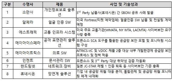 특히, 이번 지원사업은 단순히 재정적 지원에 그치지 않고 미국·유럽연합 등 주요국의 보안 요구사항 충족, 보안 취약점 조치 등을 위한 기술지원까지 함께 제공하여 소프트웨어 공급망 보안에 대한 기업들의 부담과 어려움을 최소화했으며, 실제로 해당 사업을 통해 취약점을 발굴하고 조치한 후 해외 기업과 납품 계약을 채결한 사례 또한 존재할 만큼 처음 수행한 사업임에도 많은 성과를 거둘 수 있었다.
