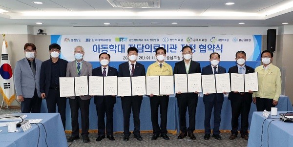 양승조 충남지사는 26일 도청에서 단국대학교의과대학부속병원, 순천향대학교부속 천안병원, 천안·공주·서산·홍성의료원과 ‘아동학대 전담의료기관 지정 협약’을 체결했다.
