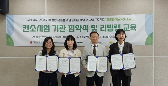 [코리아 이슈저널=김태훈 기자] 부산 동래구는 사직종합사회복지관(관장 황승호)이 지난 20일 이주배경주민의 사회적 통합 확대를 위한 소셜리빙랩 프로젝트 ‘웰온랩(Well-on Lab)’의 성공적인 추진을 위해 동래구청 및 유관 기관과 업무협약을 체결했다고 밝혔다.