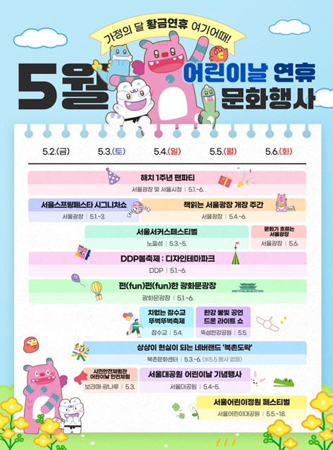 한편, 서울시에서는 황금연휴 문화·축제 정보를 서울시 공식 SNS와 누리집 등을 통해 안내하고 특히 서울시 카카오톡 채널 친구 107만명에게는 5일(월)까지 매일 알림톡으로 정보를 제공하여, ‘서울자유이용권’을 톡톡히 누릴 수 있도록 지원 할 계획이다.