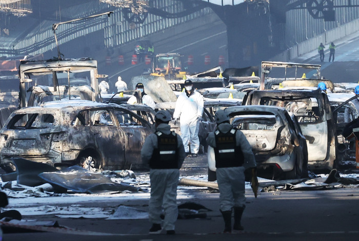 사고 현장은 관련 조사를 위해 전날 화재 진압 완료 이후 그대로 보존된 상태다. 화재로 소실된 차량 45대도 그대로 남아있다.