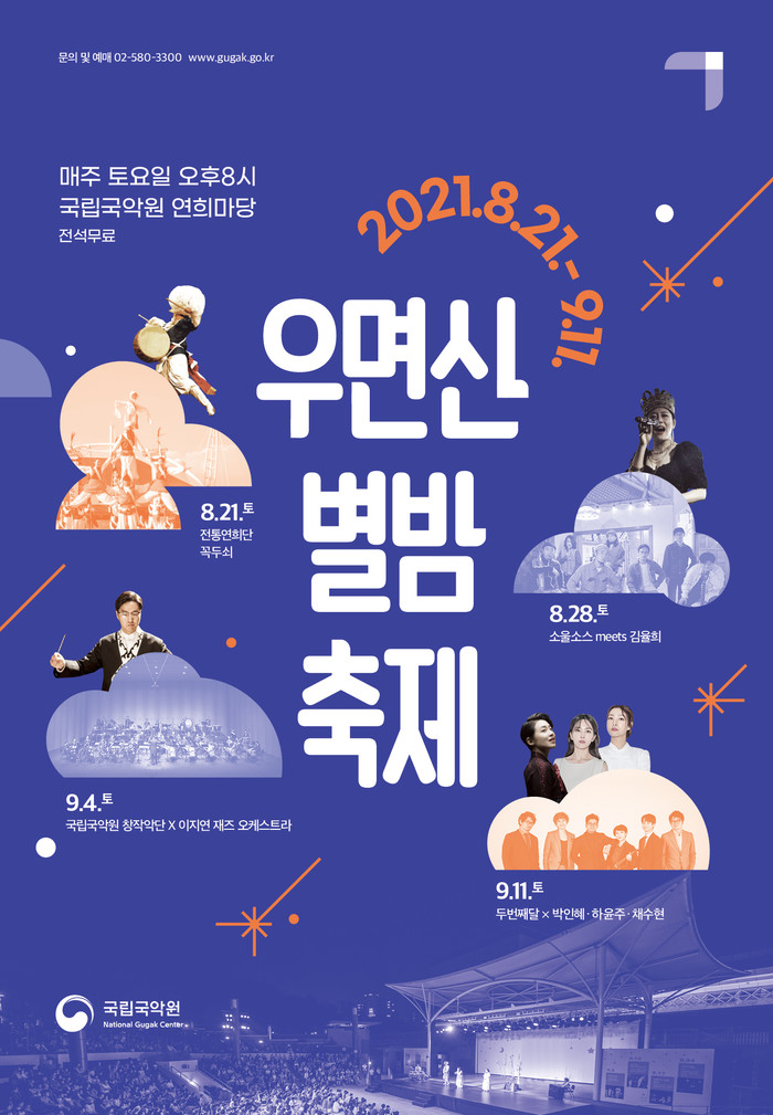국립국악원은 오는 21일부터 다음 달 11일까지 매주 토요일 오후 8시 서울 서초구 국악원 연희마당 무대에서 '우면산별밤축제'를 연다고 19일 밝혔다.