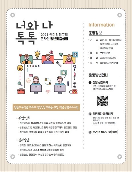 [열린의정뉴스 = 김진성 기자] 부천시 원미도서관 내 청년활동공간 원미청정구역에서는 지난 17일부터 온라인 청년 맞춤상담 프로그램 ‘너와나 톡톡’을 운영한다.