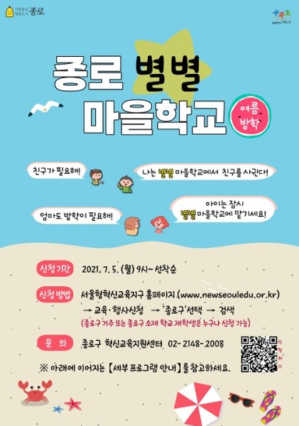 종로구에 거주하거나 관내 소재 학교 재학생이라면 누구나 참여할 수 있으며, 신청은 7월 5일(월) 09:00부터 서울형혁신교육지구 홈페이지를 통해 받는다. 프로그램별 수업일시 및 장소 등은 구청 홈페이지를 참고하거나 종로구 혁신교육지원센터(☎ 02-2148-2008)를 통해 문의하면 된다.