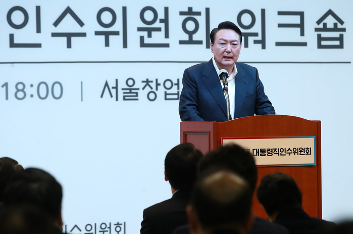 | ▲ 윤석열 대통령 당선인이 26일 오후 서울 마포구 서울창업허브 컨퍼런스홀에서 열린 제20대 대통령직인수위원회 워크숍에서 인사말을 하고 있다. 2022.3.26 [공동취재] |