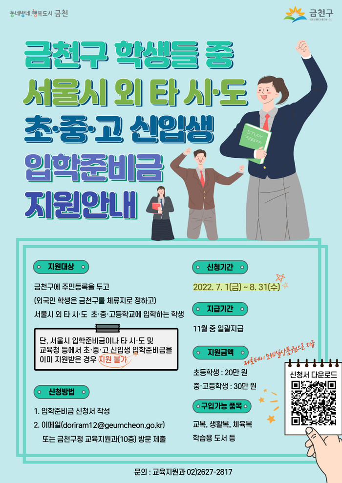 금천구는 복지 사각지대를 없애기 위해 앞으로 금천구에 주민등록을 둔 타 시·도 신입생에게도 입학준비금을 주기로 했다고 설명했다.