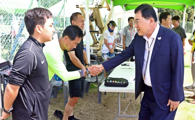 주 시장은 부산기장GO FC, 대구강북주니어, 경기김신욱FC, 충남천안시라마시아 등 전국 각지에서 모인 12개 팀 선수단에 이온음료를 전달하며 응원의 메시지를 전했다.