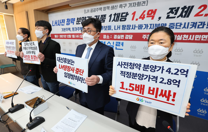 경실련은 "더 큰 문제는 국토부와 LH가 부동산 가격 상승 시 분양가를 더 인상할 수 있다고 밝히고 있는 점"이라며 "정부가 부패한 공기업과 건설업계에 부당이득을 안겨주는 대책을 집값 안정책으로 포장하는 것과 다름없다"고 지적했다.