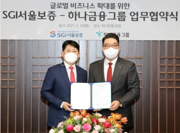 [열린의정뉴스 = 김윤영 기자] 하나금융그룹(회장 김정태)은 SGI서울보증(대표이사 유광열)과 지난 16일 하나은행 본점에서 '글로벌 비즈니스 확대를 위한 업무협약'을 체결했다고 밝혔다.
