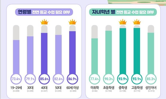 특히 학부모들(전체 응답자의 23%)의 전면등교 요구 목소리가 더 컸는데, 초등학교 학부모 90.3%, 중학교 학부모 93.9%, 고등학교 학부모 93.1%가 전면 등교를 원했다.