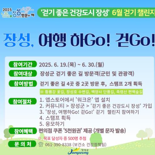 [코리아 이슈저널=김종오 기자] 장성군이 ‘2025 장성 방문의 해’를 맞아 ‘장성, 여행하고(Go)! 걷고(Go)! 워크온 챌린지’를 운영한다.