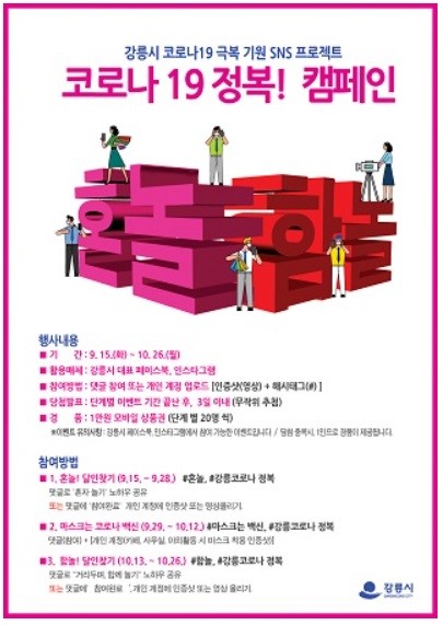 [열린의정뉴스 = 김진성 기자] 강릉시는 시민들이 코로나19로 인해 지친 마음을 서로 위로하고 함께 극복할 수 있도록 '혼놀, 함놀 SNS 캠페인'을 15일부터 오는 10월 26일까지 추진한다.