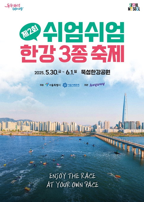 ‘제2회 쉬엄쉬엄 한강 3종 축제’는 여름의 시작과 함께 한강에서 3종 경기를 완주하거나 다양한 문화·체육 프로그램을 체험할 수 있는 축제이다.