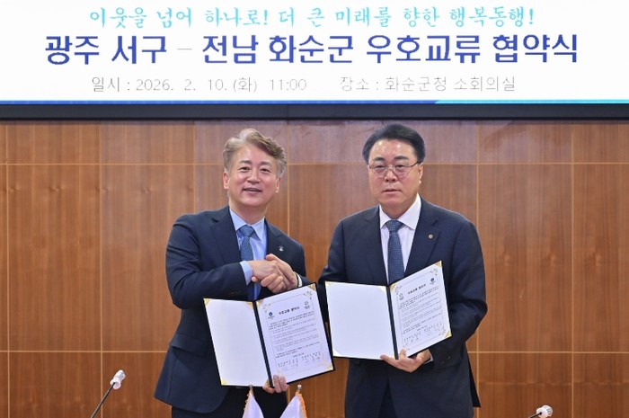 [코리아 이슈저널=김종오 기자] 광주광역시 서구는 10일 전라남도 화순군청에서 화순군과 우호교류 협약을 체결하고 생활권을 공유하는 이웃 지자체 간 협력과 공동발전을 위한 상생 체계를 구축하기로 했다.