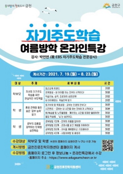 유성훈 구청장은 "이번 온라인특강을 통해 자녀의 자기주도학습을 위한 부모의 역할을 이해하고, 혼자 공부하는 전략을 통해 학생 스스로 공부하는 능력을 배양하는 기회가 되길 바란다"고 말했다.