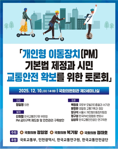 [코리아 이슈저널=홍종수 기자] 10일, 더불어민주당 정일영 국회의원(기획재정위원회, 인천 연수을)은 국회의원회관 제2세미나실에서 ‘개인형 이동장치(PM) 기본법 제정과 시민 교통 안전 확보를 위한 토론회’를 개최했다.
