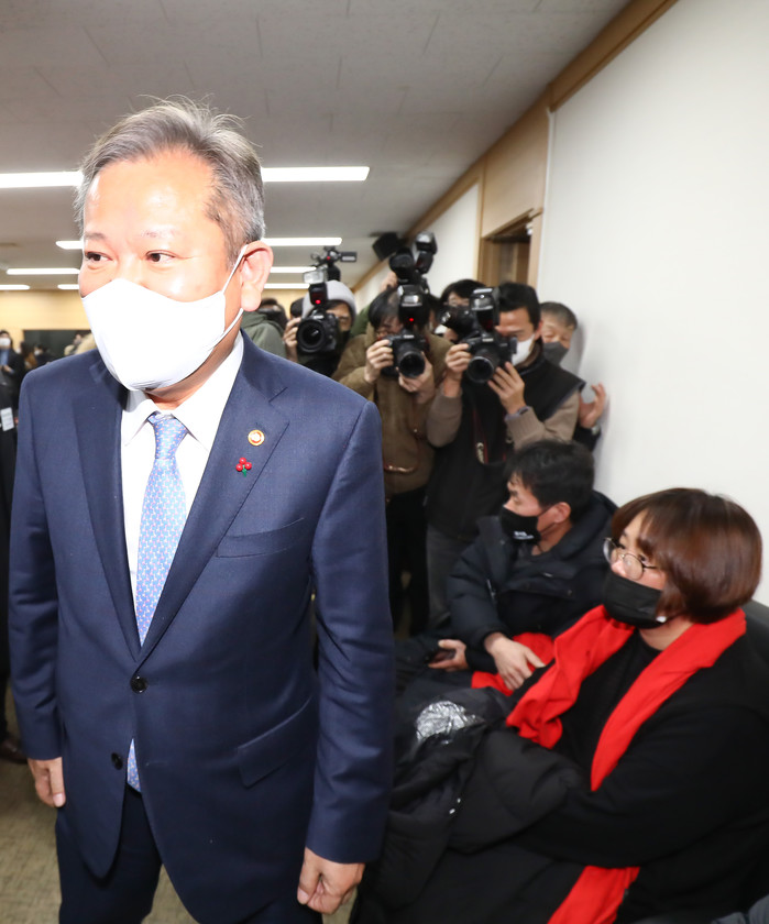 | ▲ 23일 정부서울청사 중앙재난안전대책본부 서울상황센터에서 열린 이태원 참사 국정조사 행정안전부 현장조사에서 이상민 행정안전부 장관이 회의를 마치고 나갈 때 유가족이 항의하고 있다. 2022.12.23 [국회사진기자단] |