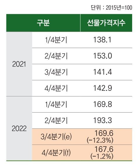 한국농촌경제연구원은 29일 '국제곡물 2022년 8월호' 보고서를 통해 "3분기 국제곡물 선물가격지수는 169.6으로, 직전 분기 대비 12.3% 하락했다"면서 "4분기에도 직전 분기(3분기)보다 1.2% 하락할 전망"이라고 밝혔다.