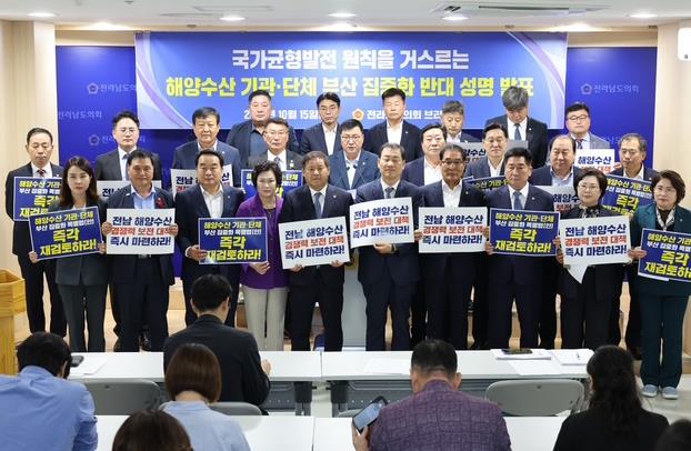 [코리아 이슈저널=홍춘표 기자] 전라남도의회 농수산위원회 최동익 의원(더불어민주당·여수)은 10월 15일 제394회 임시회 도의회 브리핑룸에서 '국가균형발전 원칙을 거스르는 해양수산 기관·단체 부산 집중화 반대 성명서'를 발표했다.