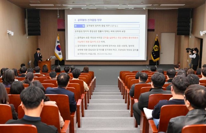 강사로 초빙된 경상남도선거관리위원회 김영환 지도담당관은 공무원의 선거중립 의무, 주요 제한·금지 규정, 실무 현장 위반 사례를 집중적으로 강의했다.