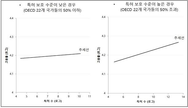 유 연구원에 따르면 특허 보호 수준이 경제협력개발기구(OECD) 22개 국가 가운데 최하위 수준일 때는 특허 수가 1% 증가 시 고용률이 0.01% 감소했다. 그러나 특허 보호 수준이 OECD 국가 가운데 최고 수준일 때는 특허 수가 1% 증가 시 고용률이 0.03% 증가했다.