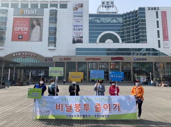 이날 유동인구가 많은 부천역 마루광장과 역곡역 다행광장을 이용하는 시민을 대상으로 마스크 착용 및 사회적 거리두기 유지 등 코로나19 예방 수칙을 준수하며 쓰레기 문제의 심각성과 이에 대처하기 위한 친환경 건강생활을 알렸다.