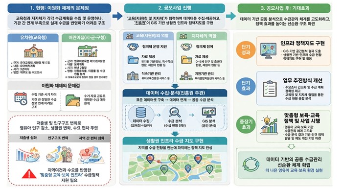 [코리아 이슈저널=최용달 기자] 교육부와 한국보육진흥원(원장 조용남)은 모든 영유아가 집 근처에서 질 높은 교육·보육 서비스를 받을 수 있도록 유치원과 어린이집 수급 정보를 한 곳에서 분석·제공하는 ‘영유아 교육·보육 인프라 데이터 체계 구축 시범지역 공모’를 실시한다.