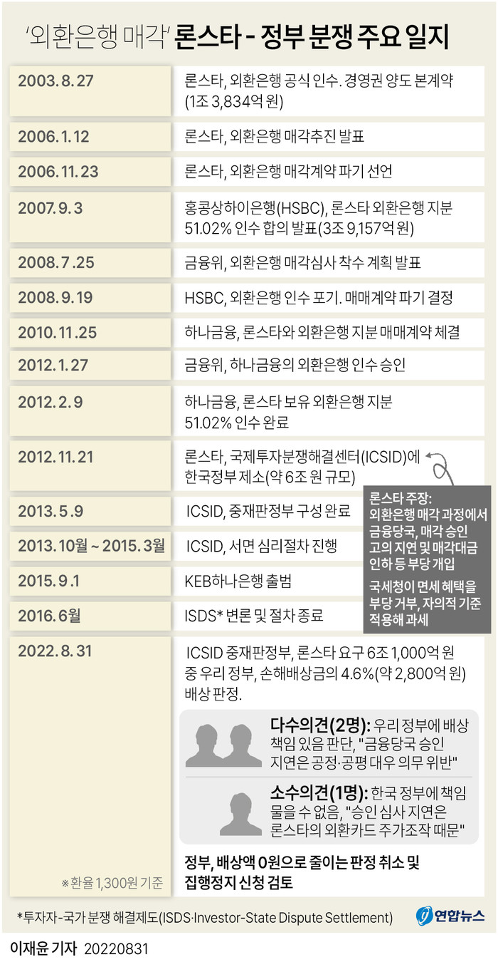 이에 따라 우리 정부에 인하된 매각 가격(4억3천300만 달러)의 절반인 2억1천650만 달러(약 2천800억원·환율 1,300원 기준)를 론스타에 배상하라고 지난달 31일 판정했다.