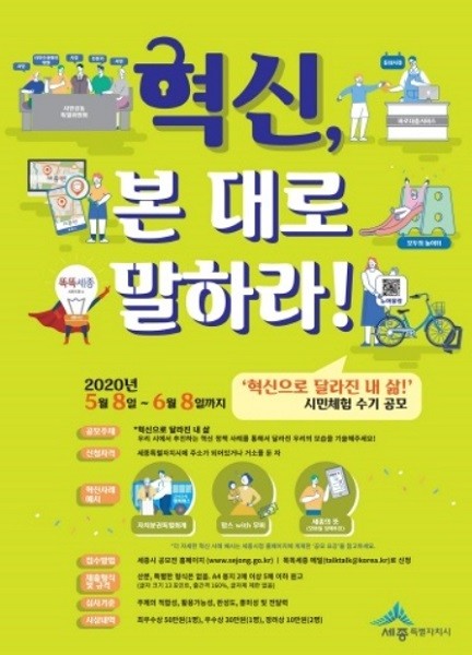 [열린의정뉴스 = 김진성 기자] 세종특별자치시(시장 이춘희)는 내달 8일까지 한 달간 '혁신으로 달라진 내 삶'이라는 주제로 혁신체험수기 공모전을 개최한다.