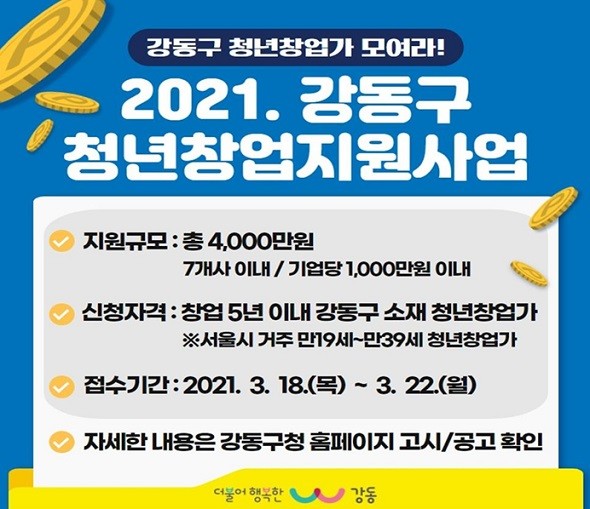 [열린의정뉴스 = 최성일 기자] 강동구(구청장 이정훈)가 우수한 아이디어와 기술력 등 성장잠재력을 갖춘 청년창업가를 육성하기 위해 ‘2021년 청년창업지원사업’ 참여기업을 3월 18일부터 22일까지 모집한다.