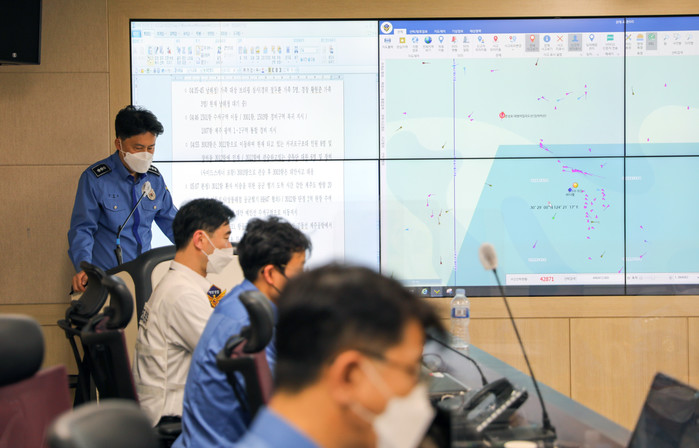 ▲ 8일 해양경찰청에서 제주남방 해역 헬기 해상추락사고 대응을 위한 중앙구조본부 비상 회의가 열리고 있다. 해경청에 따르면 이날 오전 1시 32분께 제주 마라도 인근 해상에서 남해지방해양경찰청 항공대 소속 헬기가 추락해 부기장 등 2명이 사망하고 1명이 실종됐다. 2022.4.8 [해양경찰청 제공. 재판매 및 DB 금지]