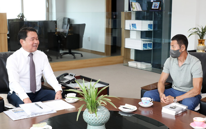 ▲ 12일 강원 춘천시 강원도교육청을 방문한 손웅정 손축구아카데미 감독이 신경호 도 교육감과 만나 학생 선수의 학습·운동 병행 등에 대한 의견을 나누고 있다. 2022.7.12 [강원도교육청 제공. 재판매 및 DB 금지]