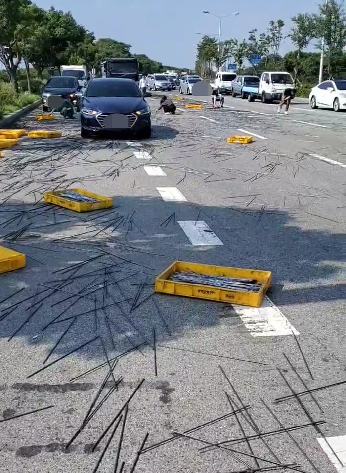 쇠봉 수 천개가 도로에 떨어지자 현장은 그야말로 아수라장이 됐고, 화물차 운전자 역시 당황할 수밖에 없었다.
