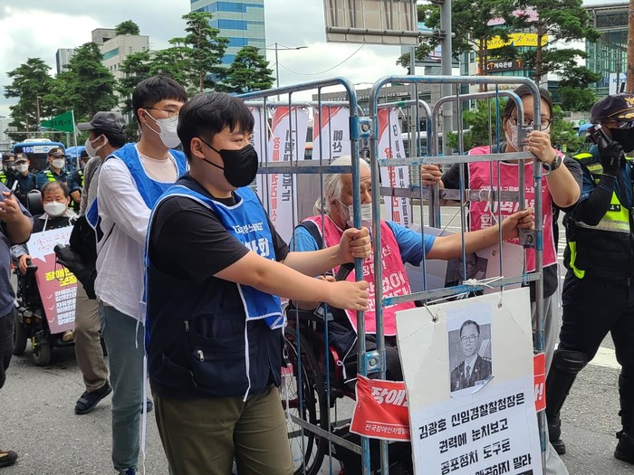 이날 기자회견에 참석한 박경석 전장연 대표는 김 청장이 장애인 편의시설 설치 계획을 먼저 밝히라며 조사를 계속 거부했다.