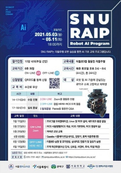 [열린의정뉴스 = 최성일 기자] 관악구(구청장 박준희)가 서울대학교 캠퍼스타운 창업 육성 프로그램의 일환으로 '서울대학교 로봇 AI 프로그램'(SNU RAIP) 교육 프로그램을 이달부터 운영한다고 밝혔다.