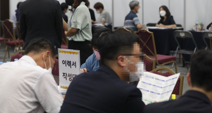 | ▲ 28일 오후 경남 창원시 성산구 창원컨벤션센터에서 열린 '2022년 자동차, 기계, 항공산업 채용박람회'에서 구직자가 이력서를 작성하고 있다. 이 박람회는 경남고용안정선제대응지원센터, 중장년일자리희망센터가 함께 개최하며 자동차, 기계 등 17개 사가 참여했다. 2022.6.28 |