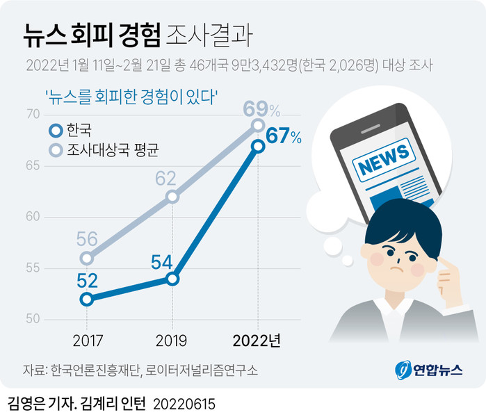 15일 발간된 '디지털 뉴스 리포트 2022'에 따르면 한국 뉴스 이용자 중 67%는 뉴스를 회피한 경험이 있었다. 2017년 52%에 비해 15%포인트 증가했다.