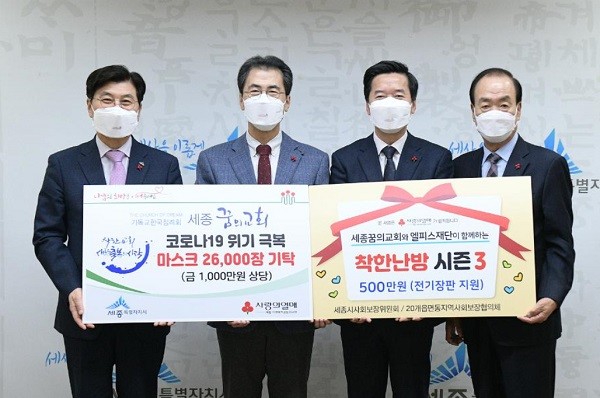 이날 행사에서는 세종꿈의교회(대표목사 안희묵)가 마스크 2만6천 매(1천만 원 상당)와 안희묵 목사가 이사장으로 겸직하고 있는 재단법인 엘피스가 성금 500만 원을 함께 전달했다.