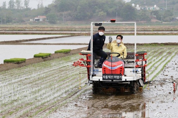 | ▲ 30일 양승조 충남도지사가 이앙기로 모내기를 하고 있다[출처=충남도청] |