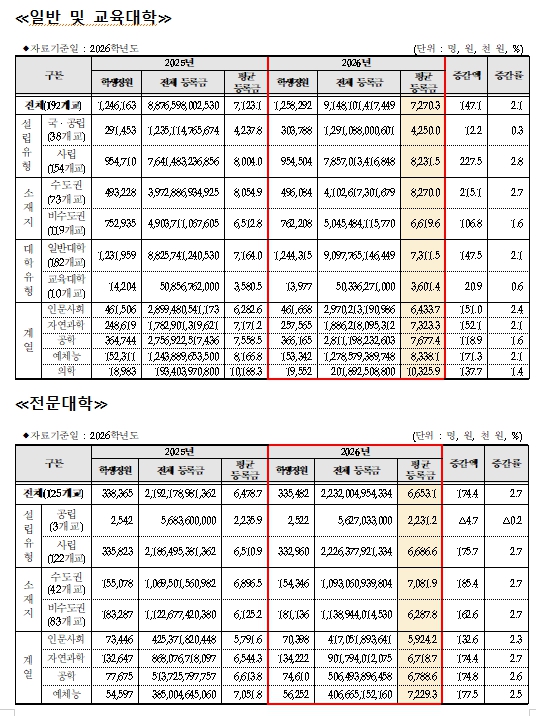 2026학년도 학생 1인이 연간 부담하는 평균 등록금은 6,653.1천 원으로 전년(6,478.7천 원) 대비 174.4천 원(2.7%) 상승했다.