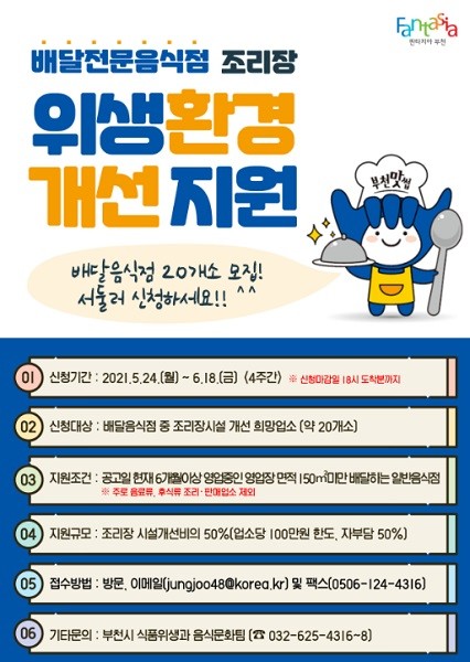 신청자격은 공고일 현재 부천시에서 6개월 이상 영업 중이며 영업장면적 150㎡미만인 배달음식점 중 조리장 시설개선을 희망하는 업소이다.